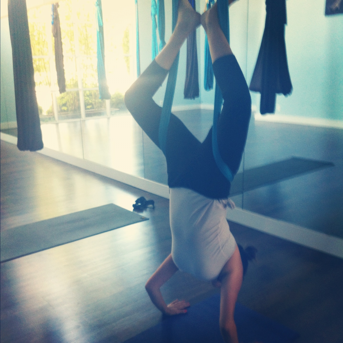 So happy to have finally tried Aerial Yoga! Let’s just say it’s much harder than it looks. I was thankful the class started with some breathing exercises to get the body relaxed and ready for suspension. Since it was my first time, I was probably more scared than most-mainly that I would fall out and hit the ground head first! Luckily this didn’t happen! Coming from FNS all week, I was a bit sore. This was perfect because it literally streches your ENTIRE body out. You know the feeling of being sore and thinking, “Ohhhh, that’s what that muscle is for?” Sort of what I am feeling this week. The teacher was great, helped us newbies out and said it would get better each time you go. The rope was a little awkward feeling around my hips at first, but she said this was normal. The poses inside the hammock allow you to relax and literally let go of everything. The only thing that was a bit scary (aside from thinking I was going to fall) was the head rush feeling of being upside down for so long….Controlling the breath helped with this unpleasant feeling! My favorite part was the last 5 minutes of breathing completely inside the hammock, like a cacoon. To be able to let go, breath and dive deep into peaceful thoughts is absolutely refreshing. Overall, it was great and a nice finish to my week! I purchased the new student 5 classes for $50 and will be back next week! Who wants to join me?