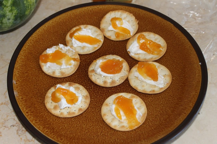 {Cracked Pepper Water Cracker, Cream Cheese and Apricot Jam}