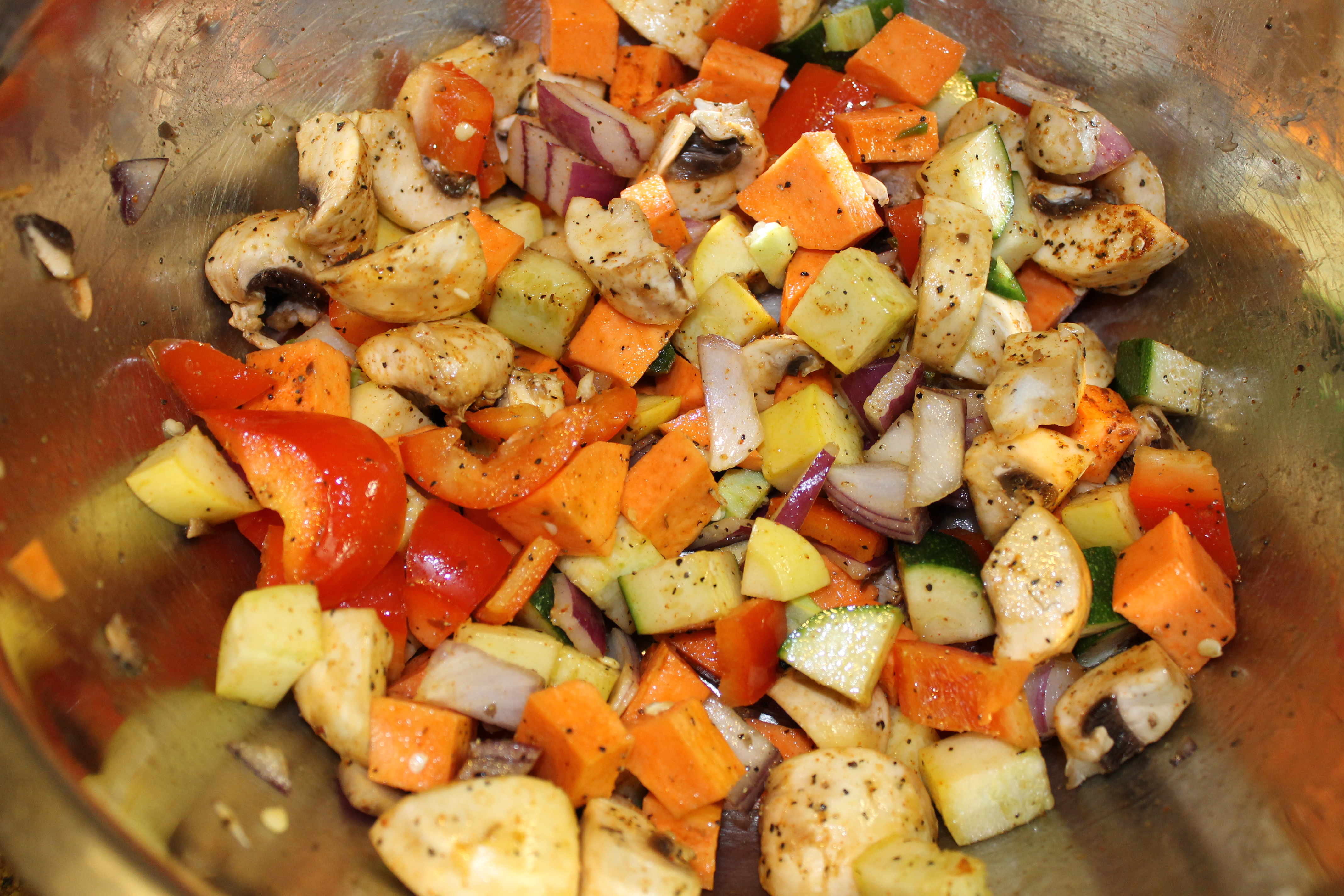 In a large bowl, toss together the yellow squash, zucchini, red onion, sweet potato, red pepper, mushroom and olive oil until evenly mixed. Season generously with salt and black pepper. I also added organic taco seasoning to the mix. Spread the mixture out evenly onto the covered baking sheet. (Vegetables should be mostly in a single layer. If you’re baking sheet is small you may need to spread these out over two baking sheets.)