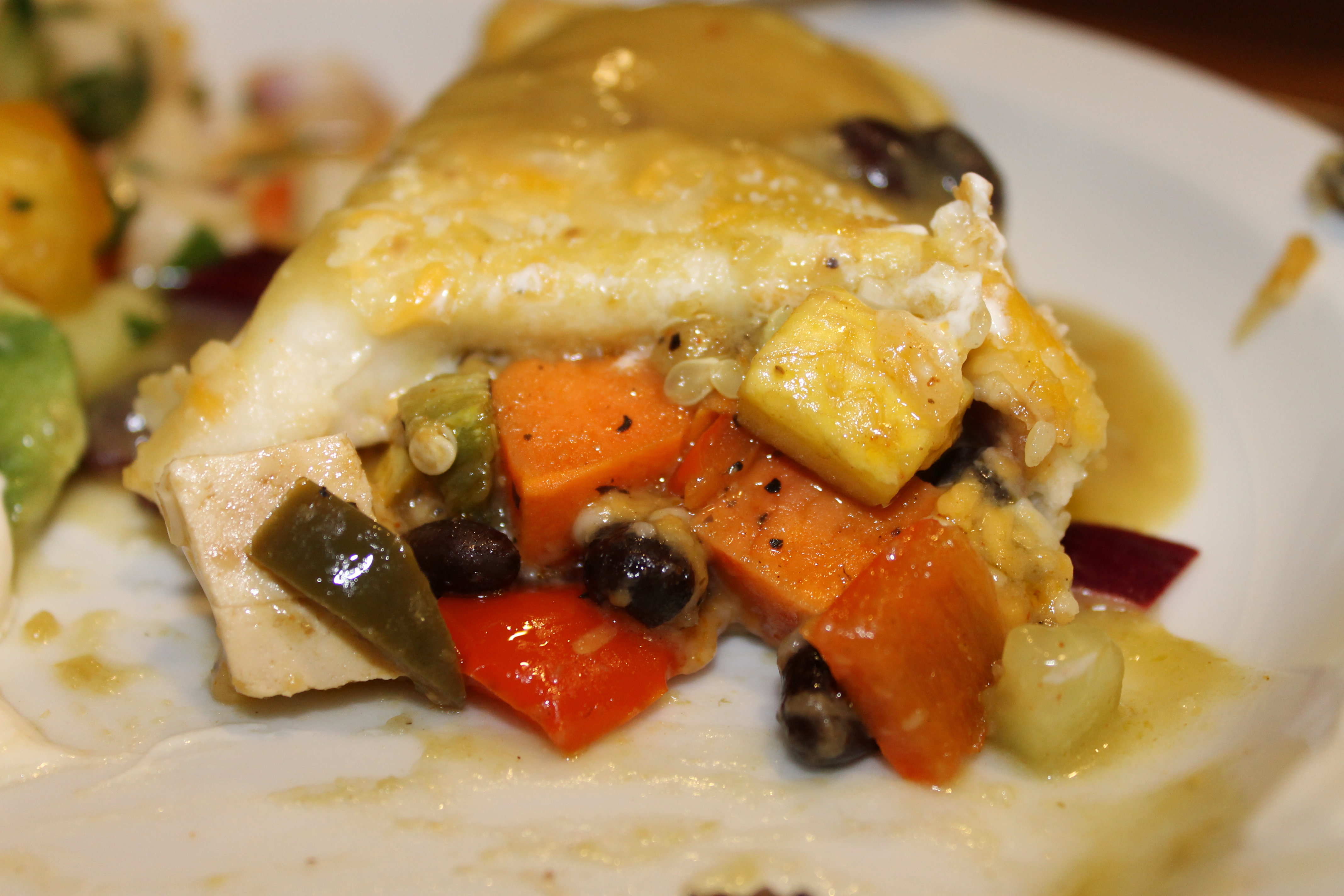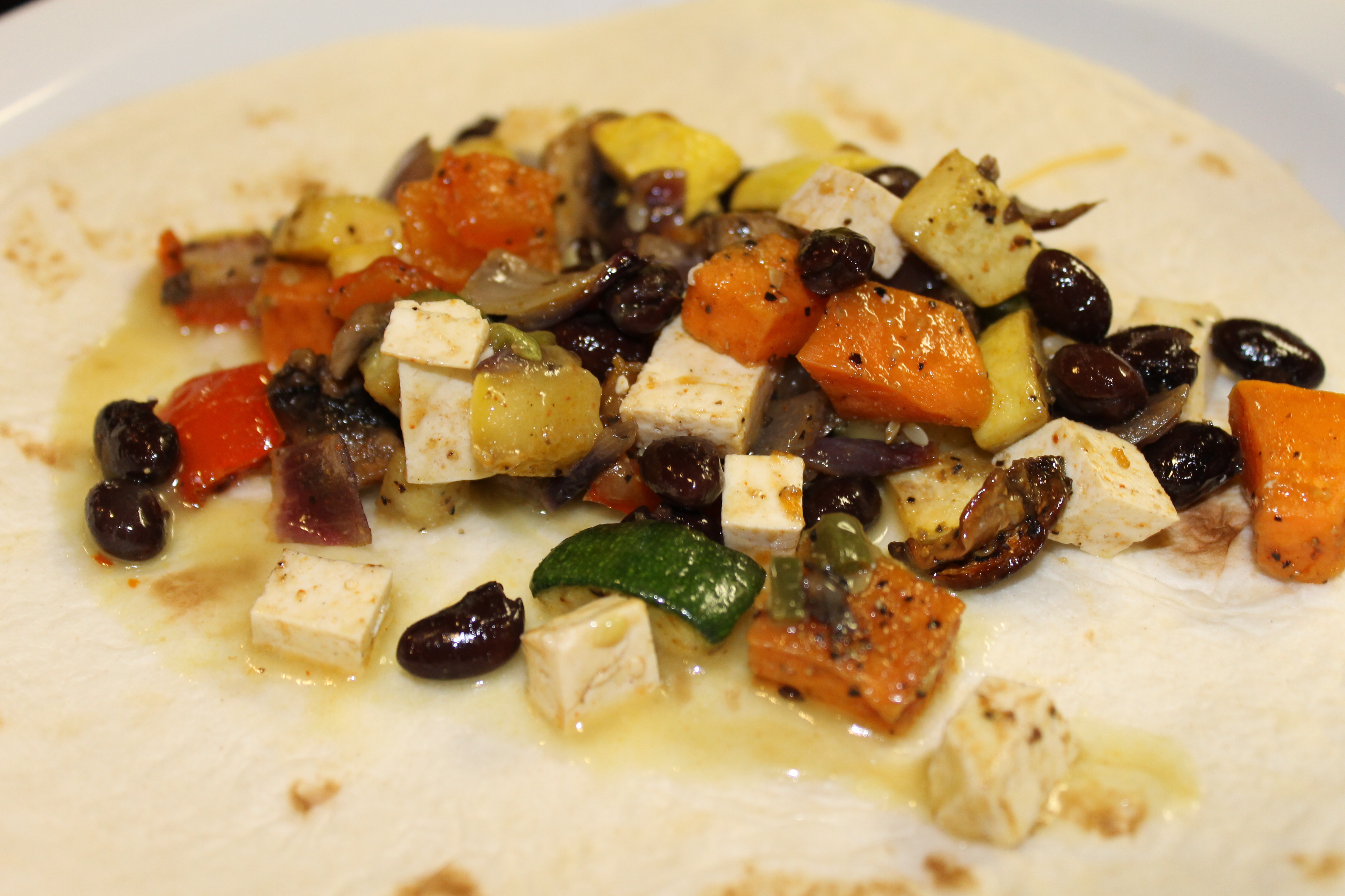 Bake for 30 min, or until the edges of the vegetables begin to crisp and they are tender. Remove and set aside to cool. After the veggies were cool, I added tofu and black beans to the mix. Reduce oven heat to 350 degrees.