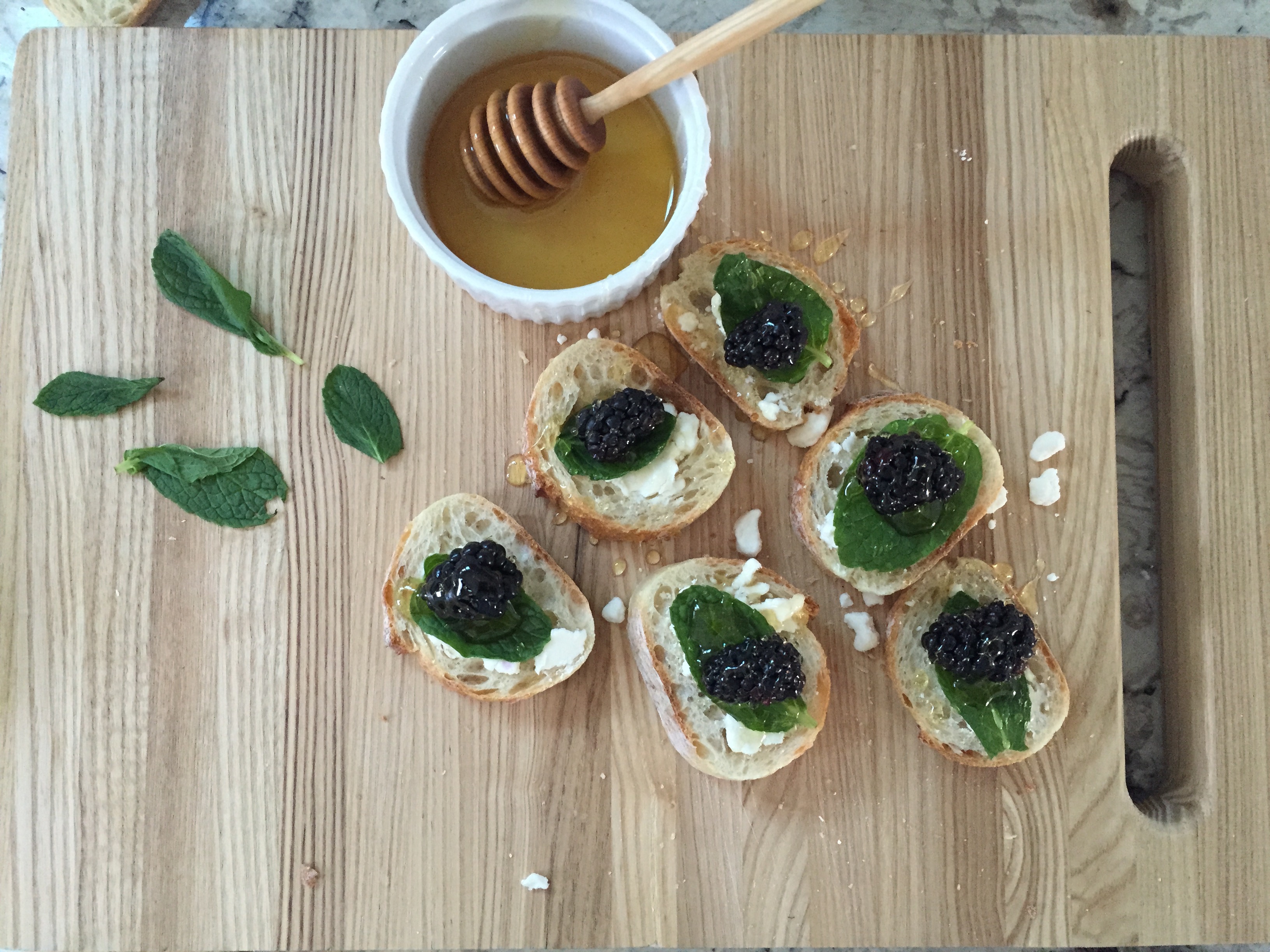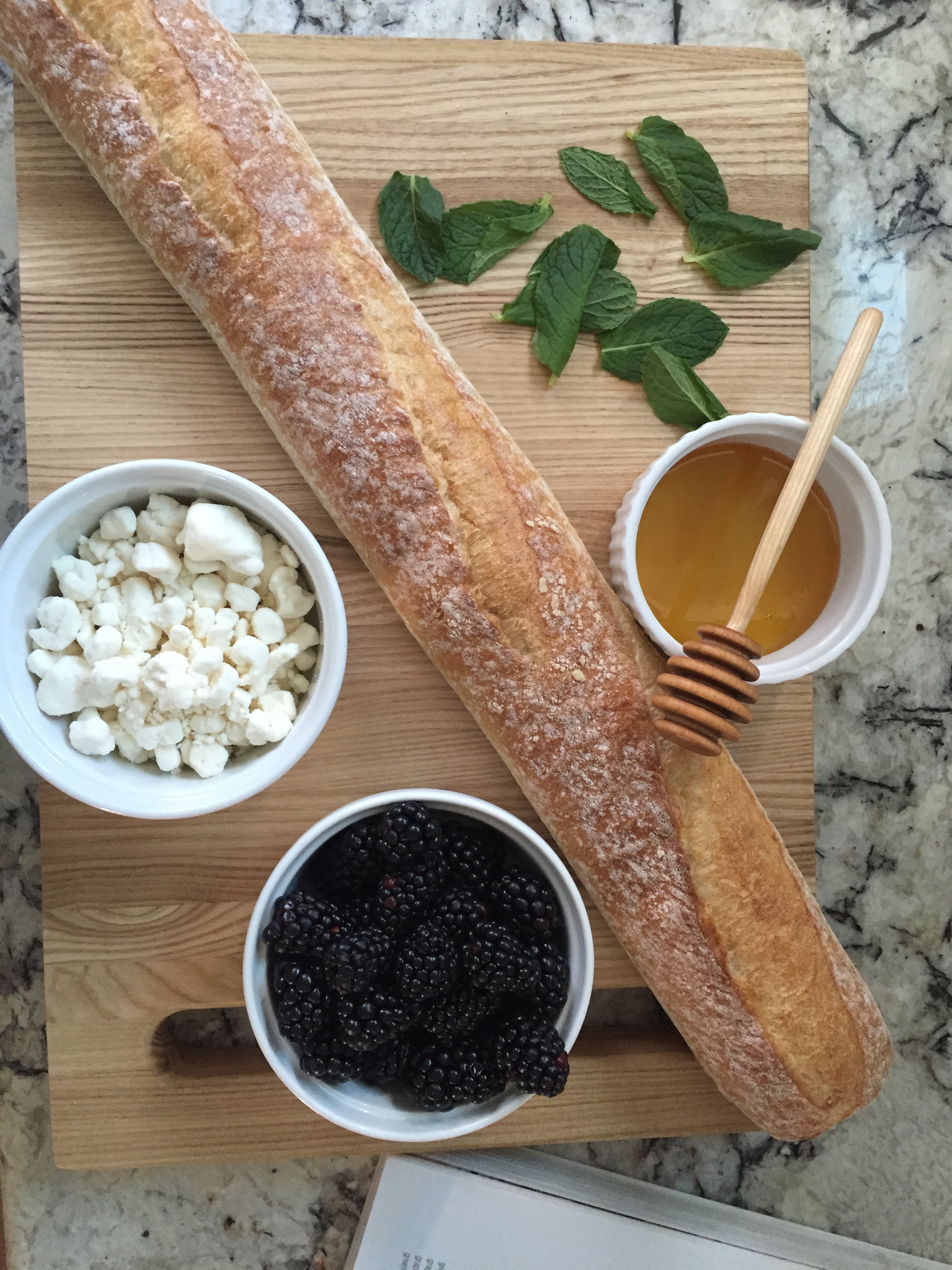 What you'll need : - Baguette - Organic Blackberry - Organic Goat Cheese - Organic Mint - Organic Honey