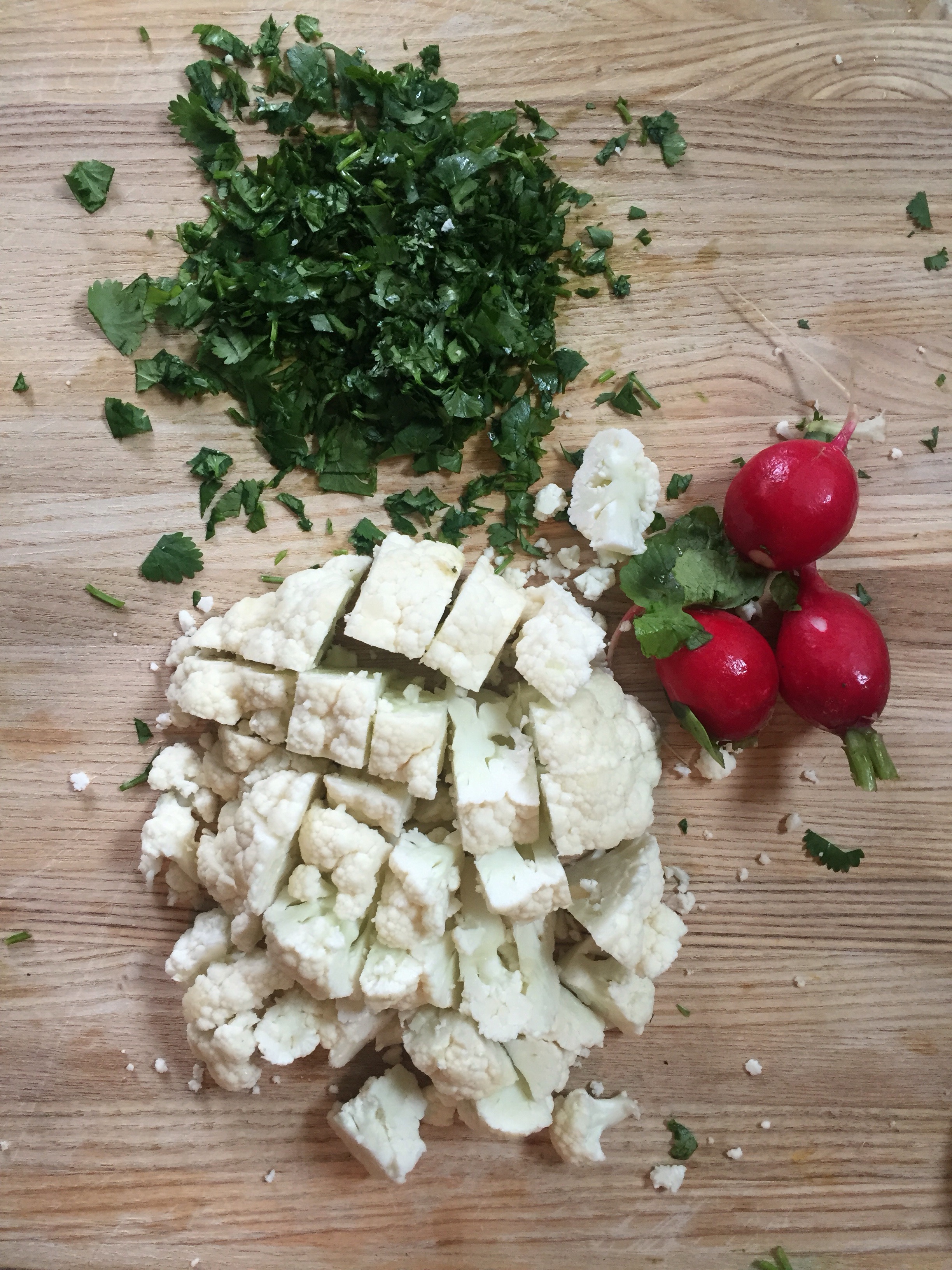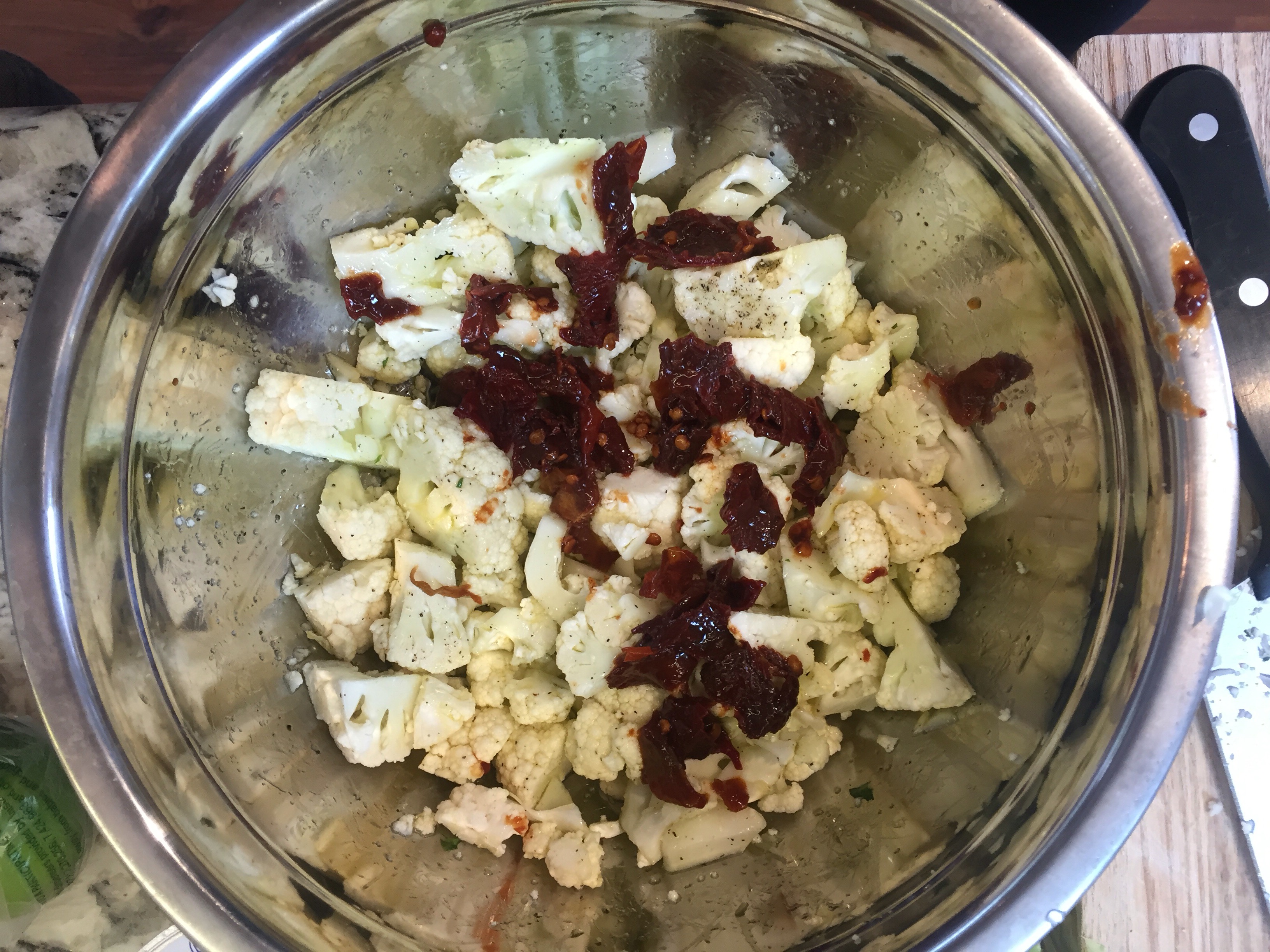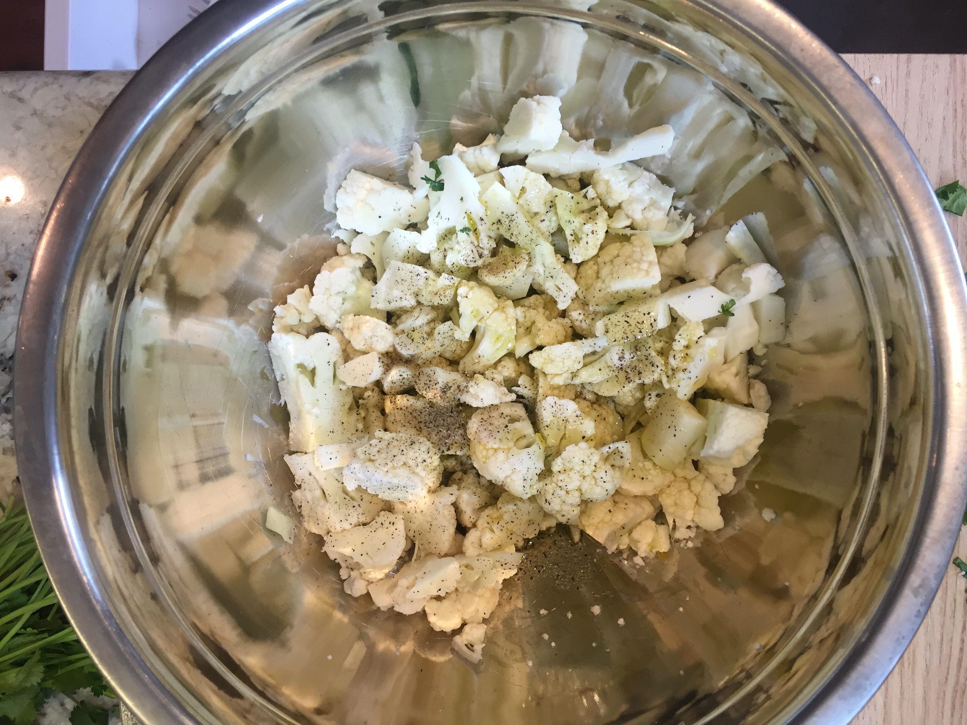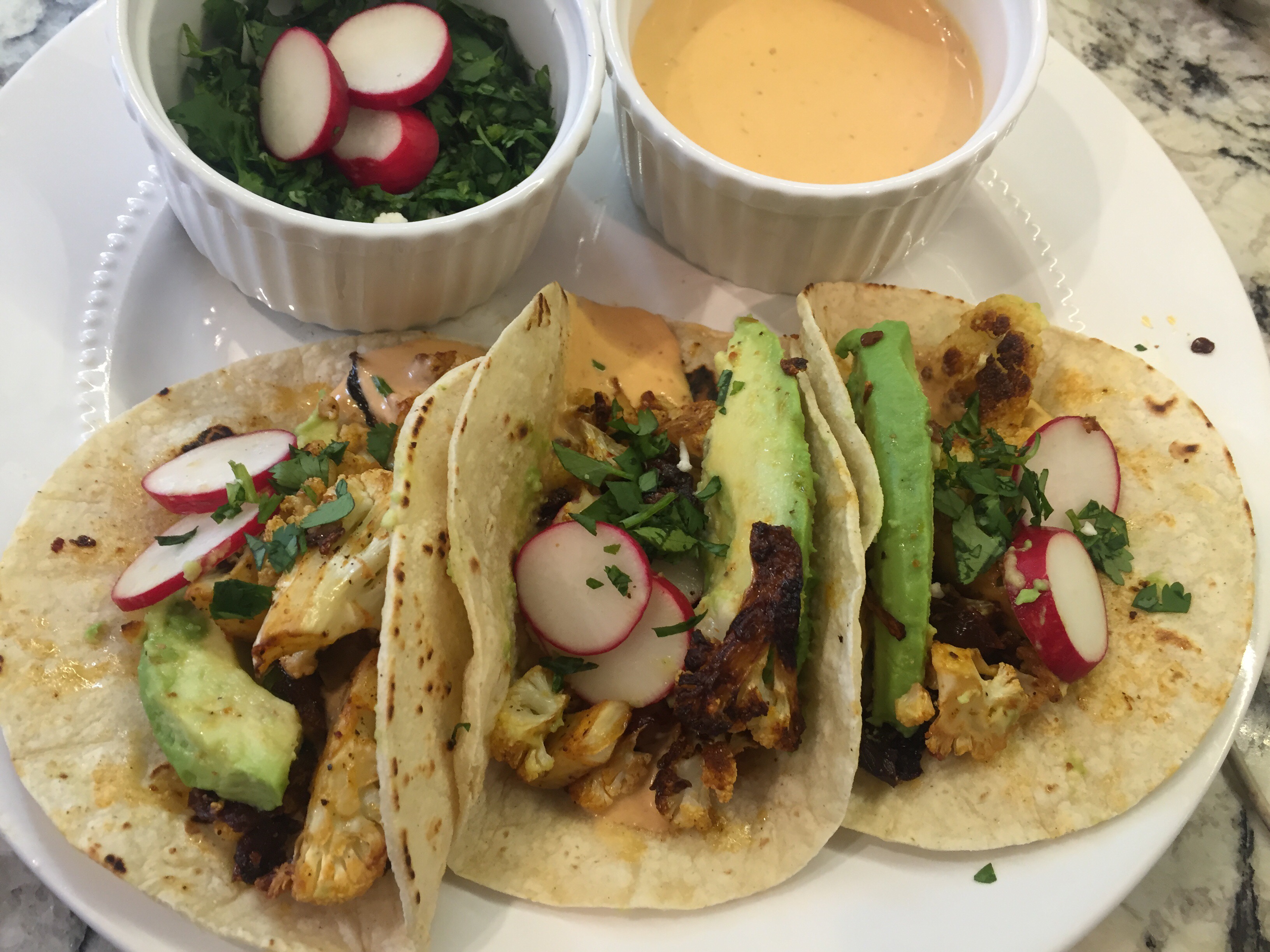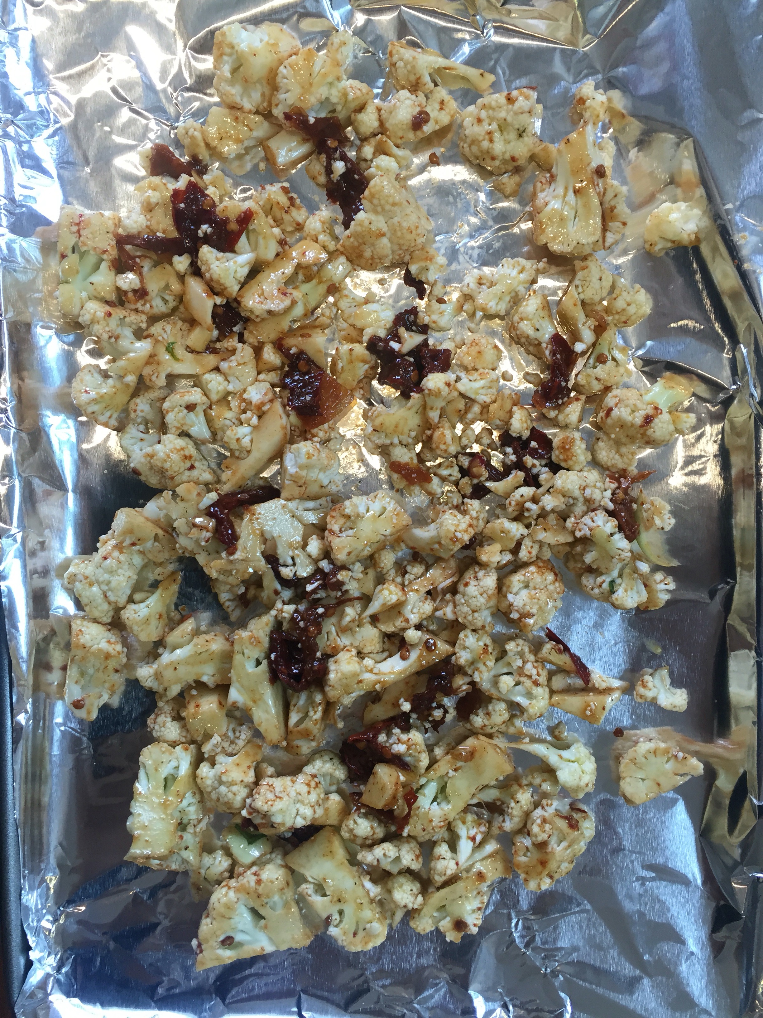Line a large baking sheet with parchment paper (I didn’t have parchment so I used foil). Add the cauliflower and drizzle with olive oil and a pinch of salt and pepper. Toss to combine. Working over the baking sheet, use your hands to break up 2 chipotle peppers, along with some of the adobo sauce. Toss again to coat the cauliflower and roast for 25-30 minutes, or until golden brown.